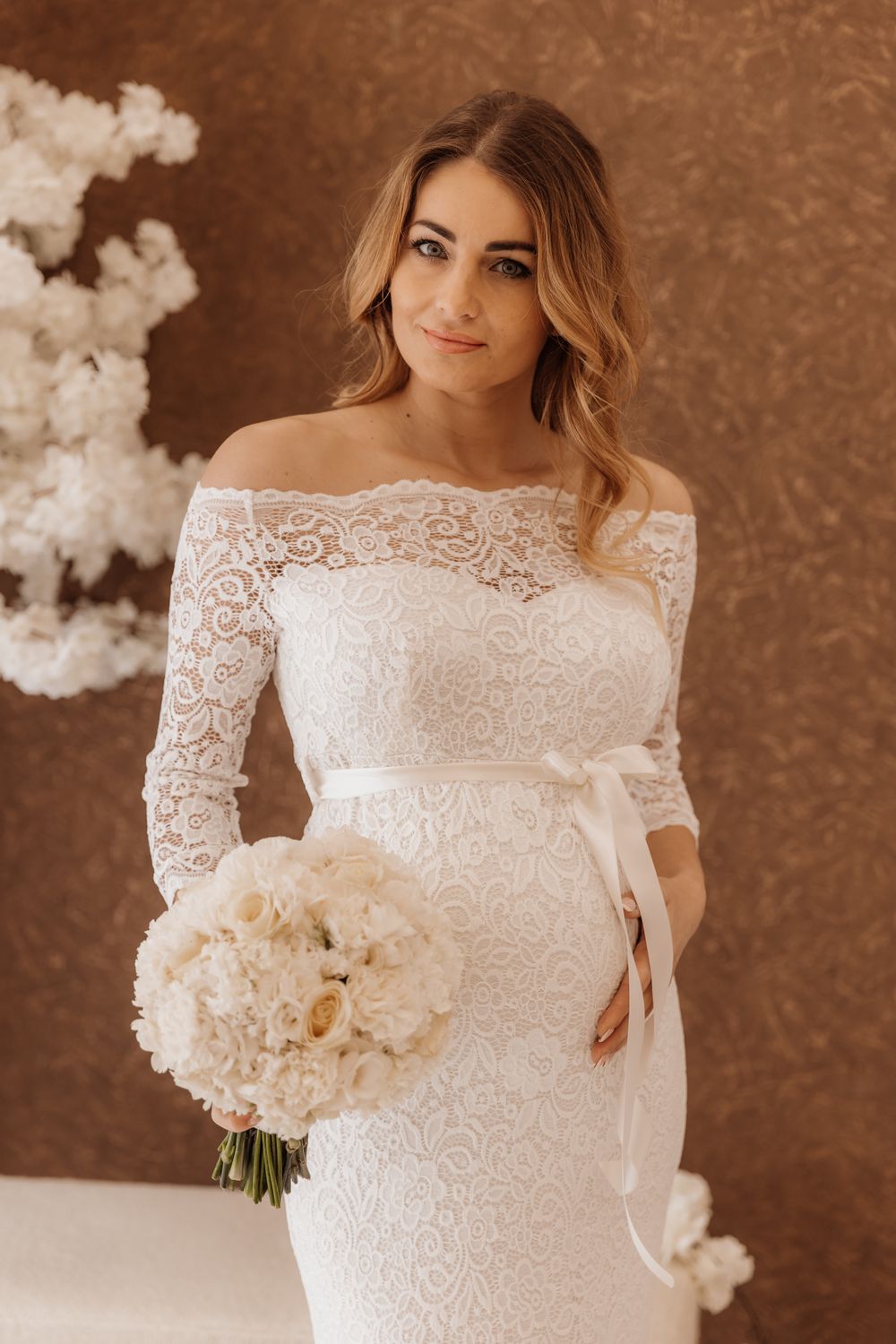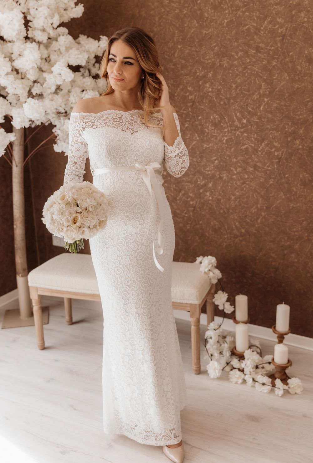 Az ekrű színű csipke varázslatosan nőies és elegáns megjelenést biztosít, míg az alakkövető sellő fazon kiemeli a terhességed legszebb vonalait.